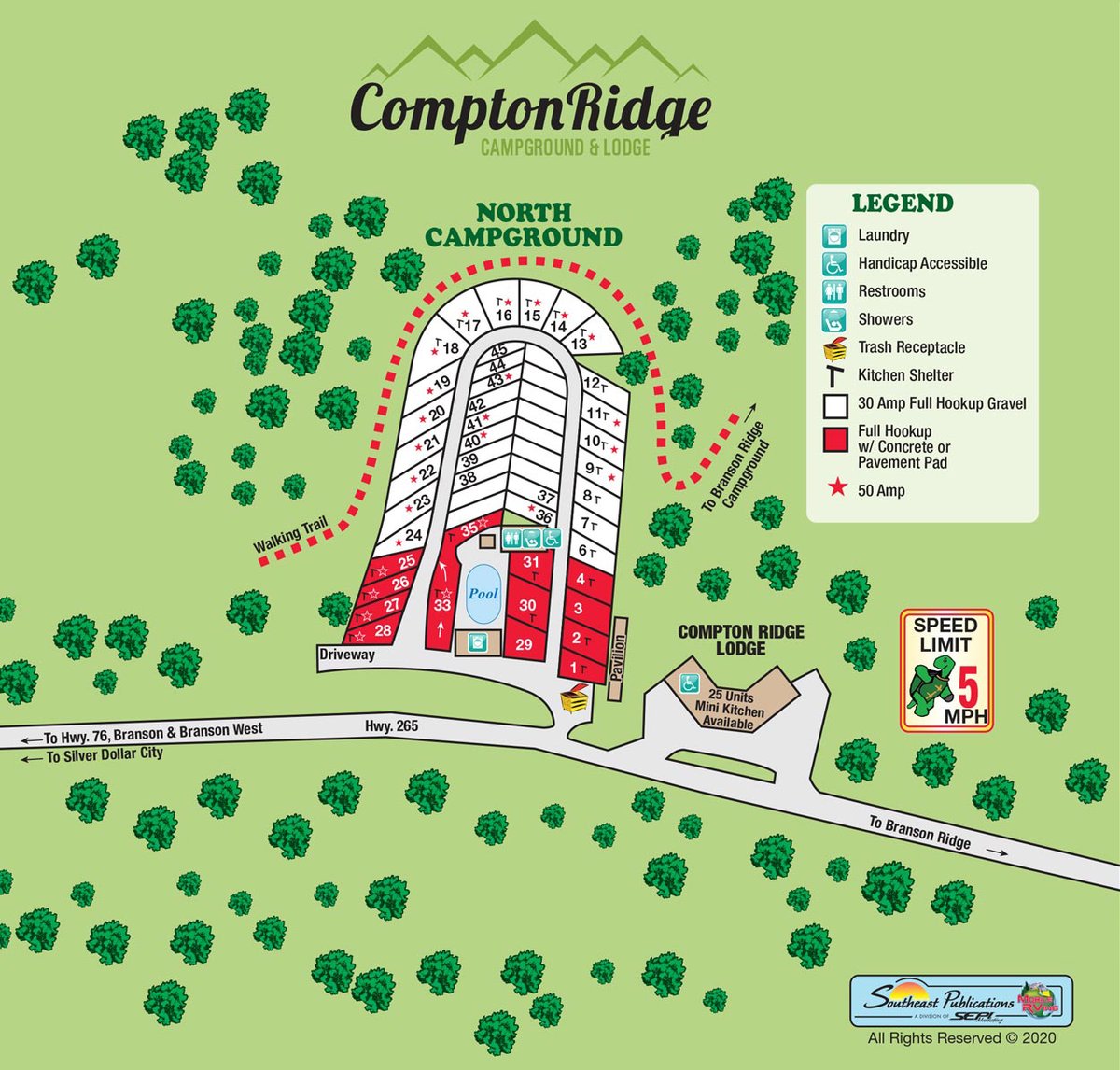 Compton Ridge RV Park and Lodge offers 30 Amp Sites, 50 Amp Sites, Lodge Rooms.